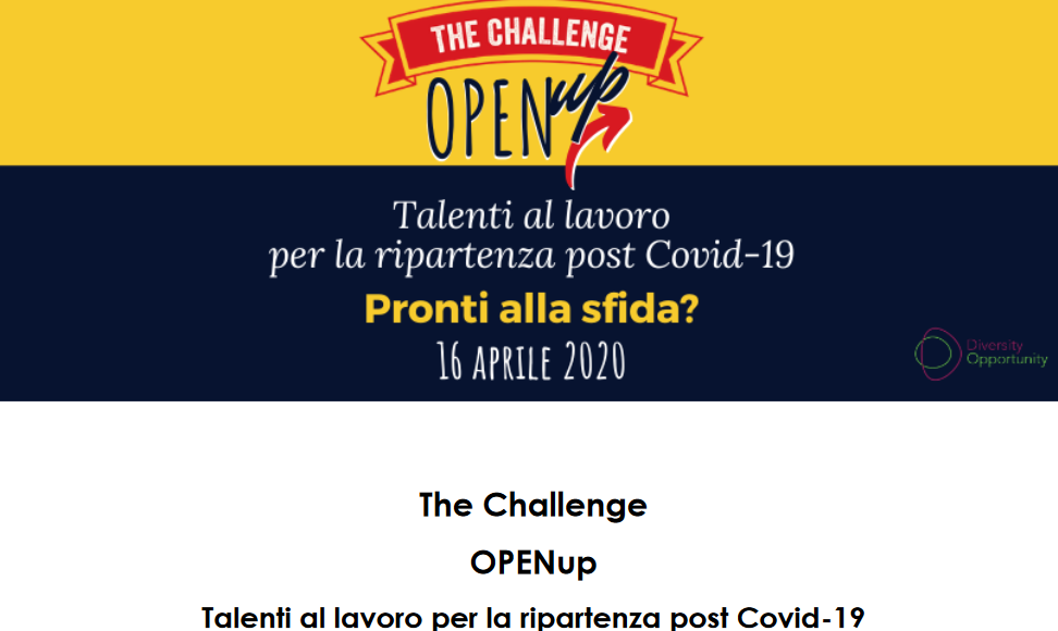 Una nuova iniziativa di “Diversity opportunity” per prepararsi al post emergenza. Dopo la learning lesson su “Il cambiamento che saremo”, il team di Diversity Opportunity organizza una Challenge in cui 12 partecipanti, selezionati sulla base dei curricula inviati, saranno suddivisi in 4 squadre per sfidarsi su uno di questi temi: