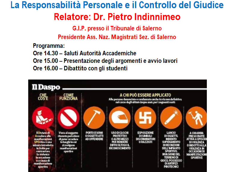 Il prossimo appuntamento si terrà martedì 30 giugno, alle ore 14:30, con il Dottor Piero Indinnimeo, attualmente G.I.P. presso il tribunale di Salerno. Questo seminario si inserisce nel ciclo tematico che, nell’ultimo mese, ha già visto la preziosa partecipazione della Campionessa olimpica, Manuela di Centa e del Campione mondiale non vedente di Sci nautico, Daniele Cassioli.