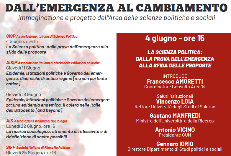 Dall’emergenza al cambiamento. Immaginazione e progetto dell’Area delle scienze politiche e sociali è il titolo scelto per il ciclo di webinar dedicato al contributo che i saperi di quest’area scientifica sono in grado di offrire al Paese alle prese con una delle più impegnative sfide della sua storia repubblicana.