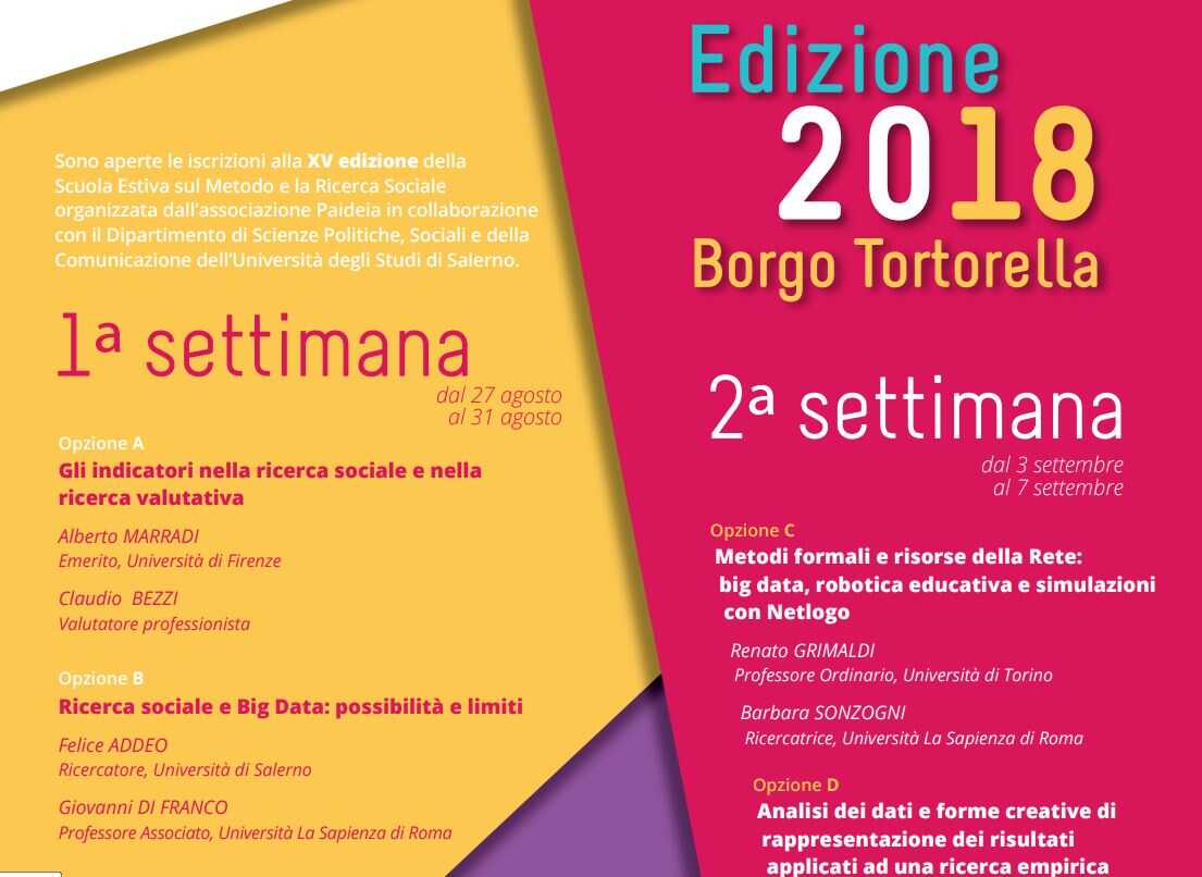 Paideia e il Dipartimento di Scienze Politiche Sociali e della Comunicazione dell’Unisa organizzano la XV Scuola estiva sul Metodo e la Ricerca Sociale. La Scuola Estiva sul Metodo e la ricerca Sociale propone un programma di alta formazione rivolto a studenti universitari, dottorandi, ricercatori e professionisti che desiderano approfondire la teoria e le tecniche dei diversi metodi standard della ricerca sociale.