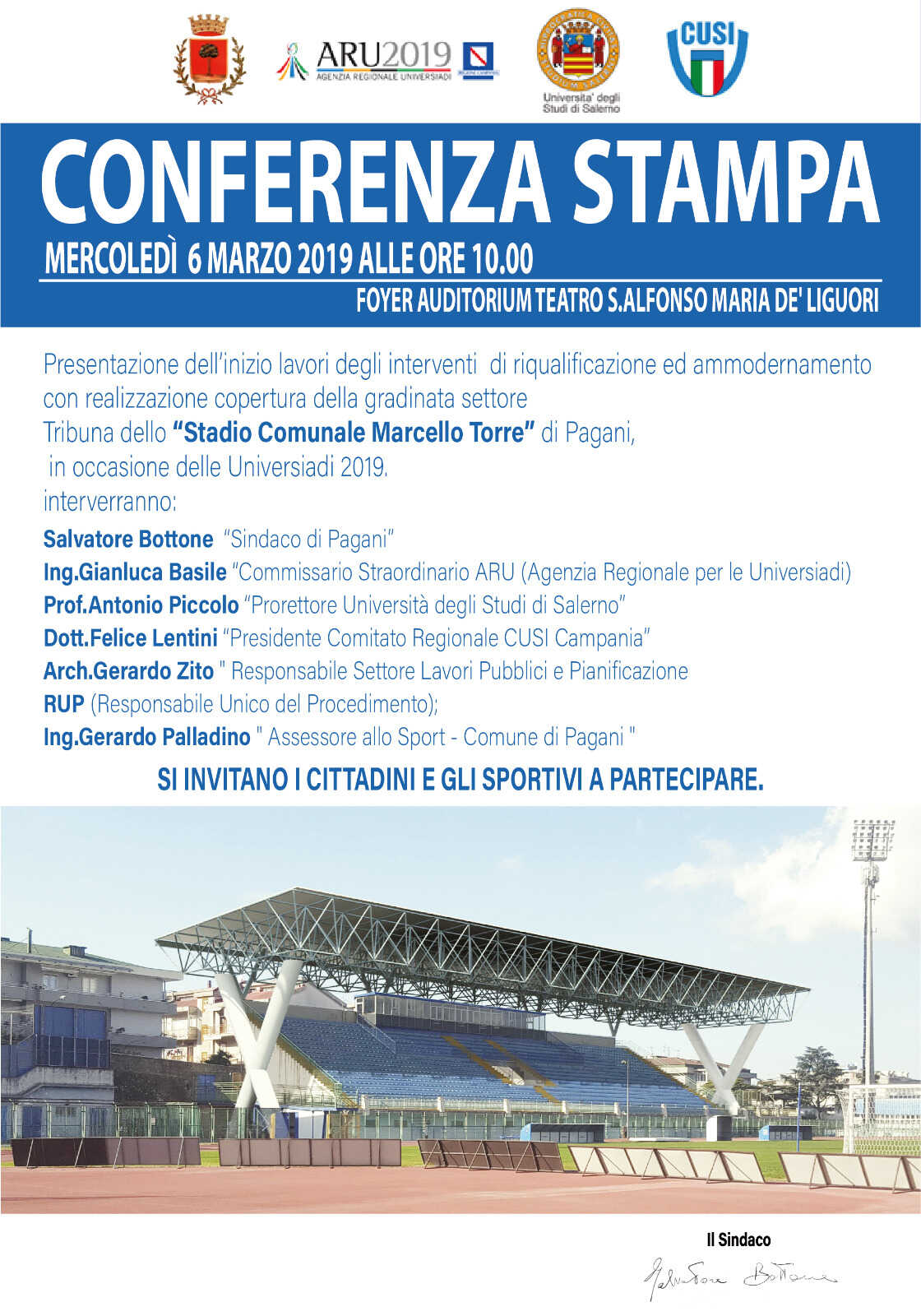 Si terrà mercoledì 6 Marzo 2019 alle ore 10.00 presso il Foyer dell’Auditorium Sant’Alfonso Maria de Liguori (piazza Sant’Alfonso – Pagani) la Conferenza Stampa di presentazione dell’inizio dei lavori riguardanti gli interventi di riqualificazione ed ammodernamento dello Stadio Comunale Marcello Torre in occasione delle Universiadi 2019.