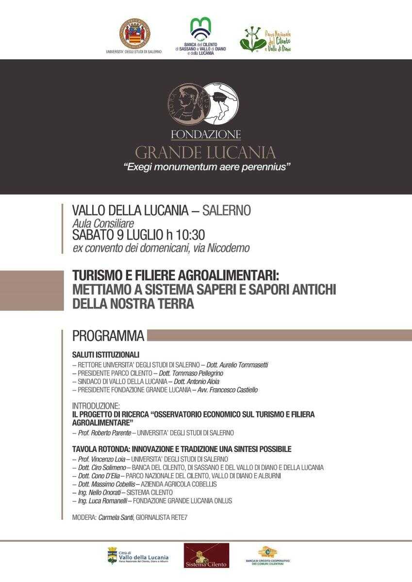 Si terrà questa mattina, presso l’Aula consiliare dell’ex convento dei domenicani a Vallo della Lucania, il convegno tematico “Turismo e filiere agroalimentari”, promosso dalla Fondazione Grande Lucania, con il patrocinio dell’Università di Salerno, del Parco Nazionale del Cilento, Vallo di Diano e Alburni e della BCC Cilento. Prenderanno parte all’incontro, tra gli altri: il rettore Aurelio Tommasetti, il presidente del Parco Tommaso Pellegrino, il sindaco di Vallo della Lucania Antonio Aloia, il presidente della Fondazione Grande Lucania, Francesco Castiello, i proff. Vincenzo Loia e Roberto Parente (Università di Salerno).