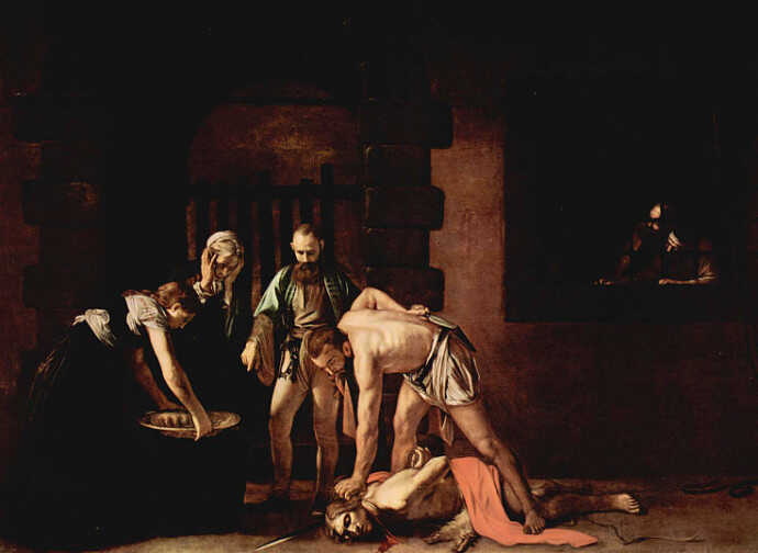 Qualche tempo dopo, tuttavia, Erodiade ebbe l’occasione tanto desiderata e propizia per soddisfare il suo odio contro il Precursore di Cristo. Mentre Erode celebrava il suo compleanno e teneva un banchetto a tutta la corte, Salome, figliola di Erodiade e nipote di Erode, si presentò nella sala del convito e si pose a danzare. Ciò piacque a tutti, tanto che Erode le promise di concederle qualunque cosa avesse domandato, fosse anche la metà del regno. Salome a queste parole, non sapendo cosa domandare, corse da sua madre e questa le ordinò di chiedere la testa di Giovanni. Salome ritornò in fretta dal re e lo pregò di farle portare subito in un bacile la testa del santo Precursore. Erode, benché sorpreso ed afflitto da questa domanda, ordinò di accontentarla. La fanciulla come ebbe tra le mani quel sacrosanto capo, lo portò a sua madre, la quale, a tal vista, esultò di gioia e si dice che per vendicarsi della libertà con cui il Santo aveva disapprovato i suoi disordini, trafisse con un ago quella sacra lingua.