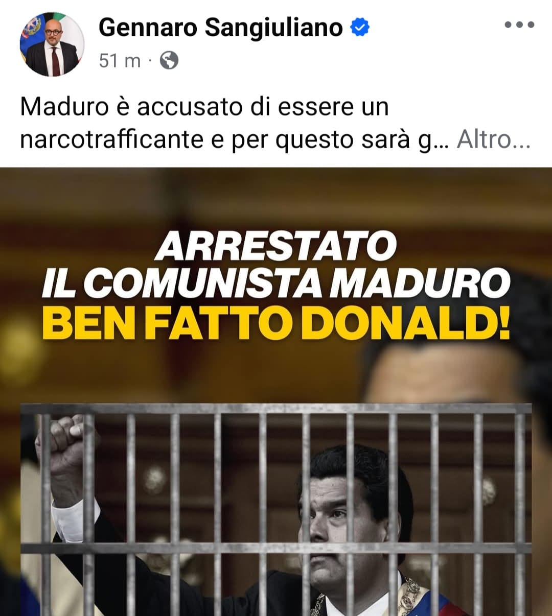 Mentre il governo guidato da Giorgia Meloni segue con attenzione quanto sta accadendo in Venezuela, in stretto contatto con il Ministro degli Esteri Antonio Tajani, da Fratelli d’Italia non si registrano commenti, evidentemente per la gravità della situazione. A dettare la linea del partito è il capogruppo di Fdi in Campania, Gennaro Sangiuliano, che ha pubblicato sui social un fotomontaggio di Maduro dietro le sbarre con la scritta “Arrestato il comunista Maduro, ben fatto Donald!”. Chi sa se Giorgia Meloni apprezzerà…