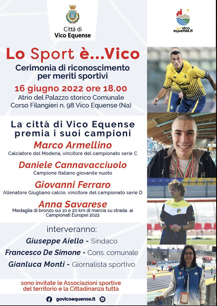 Giovedì 16 giugno alle ore 18.00 nell’atrio del palazzo storico comunale di Vico Equense celebreremo alcuni atleti che si sono contraddistinti per meriti sportivi. Si tratta di: