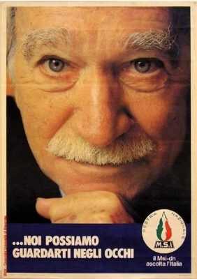 Giorgio Almirante è nato Salsomaggiore Terme, 27 giugno 1914, è stato un politico e giornalista italiano. Durante la Repubblica Sociale Italiana, ricoprì la carica di capo di gabinetto al Ministero della Cultura Popolare. Nell’immediato dopoguerra fu tra i fondatori del partito di ispirazione fascista Movimento Sociale Italiano (1946), e deputato dal 1948 in poi. Segretario del MSI nel 1947-1950 e poi tra il 1969-1987; ha appoggiato nel 1972 la fusione con i monarchici, mutando la sigla del suo partito in quella di MSI – Destra Nazionale.