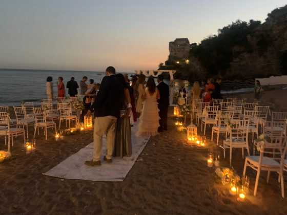 L’esclusiva location scelta dagli sposi è il noto Lloyd’s Baia Hotel di Vietri sul Mare, cornice del loro rito civile, in un angolo suggestivo della spiaggia che vede il tramonto scomparire tra le rocce della Costiera Amalfitana.