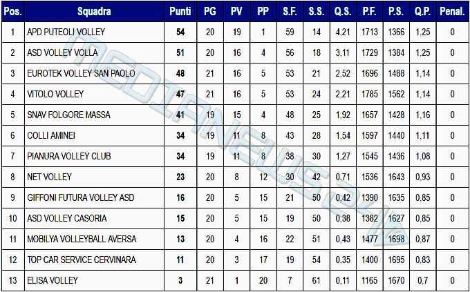La classifica vede ora i nocerini al quarto posto, con 47 punti in 21 gare, a una sola lunghezza di distacco dall’Eurotek San Paolo Belsito. Ma tra le due litiganti, alla fine potrebbe spuntarla il cosiddetto “terzo incomodo”: la Snav Folgore Massa dovrà infatti giocare ben 2 partite in più rispetto a San Paolo Belsito e Vitolo Volley, avendo già osservato il suo turno di riposo e dovendo pure recuperare una partita il prossimo 11 maggio.