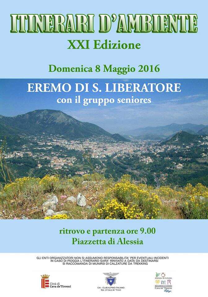 Domenica 8 maggio 2016, si terrà un’altra tappa della XXI edizione di Itinerari d’Ambiente, il programma di escursioni che coniuga natura e cultura promosso dalla locale Azienda Autonoma di Soggiorno e Turismo, del Commissario Straordinario, Arch. Carmine Salsano. Il ritrovo è previsto alle ore 9.00 in località Alessia di Cava de’ Tirreni per poi proseguire per l’Eremo di San Liberatore. La partecipazione è gratuita e aperta a tutti.